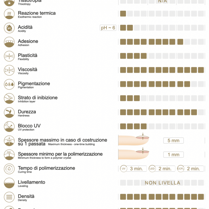 – dopo la polimerizzazione il prodotto è sufficientemente duro, minimamente ammortizzato, caratteristica dei prodotti per l’irrigidimento e l’allungamento delle unghie,