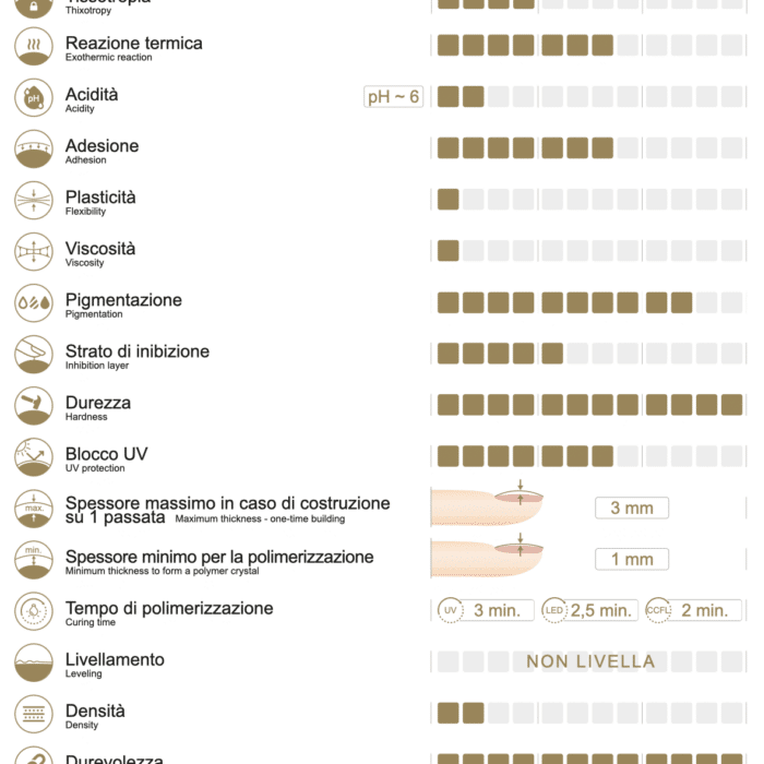 Inoltre, i nostri gel possono essere utilizzati per l’allungamento delle unghie senza limatura, grazie al metodo di applicazione appropriato. L’aspetto più singolare è che i colori di questa gamma di gel sono esattamente identici a quelli della gamma di gel tixotropici, consentendo di combinare perfettamente questi prodotti senza preoccuparsi di scolorimenti o differenze di colore. Ciò è particolarmente utile quando si costruiscono le unghie con gel non livellanti e si ritoccano con gel tixotropici, un’operazione molto apprezzata dagli stilisti.
