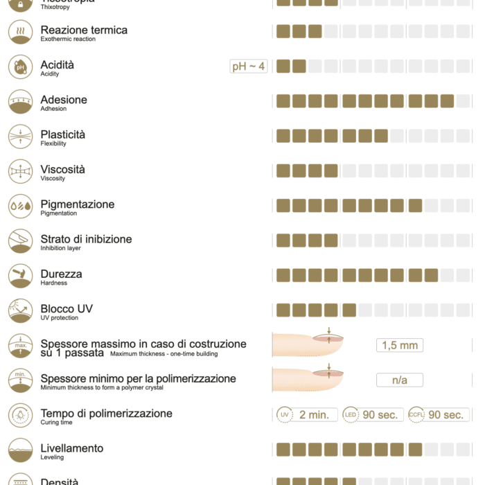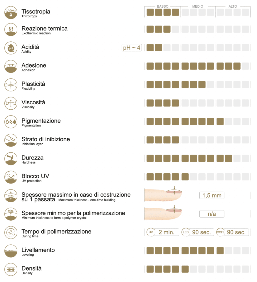 • Il prodotto ha una consistenza cremosa e di media densità e un’eccellente tissotropia, che ne facilita notevolmente la lavorazione, in quanto si stende uniformemente senza inondare le cuticole.