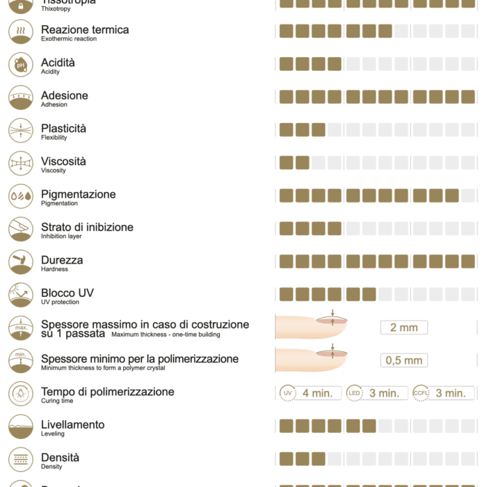 - eccellente tixotropia il prodotto ha un’alta tensione superficiale, si livella molto lentamente, quindi non allaga le cuticole e dà il tempo di costruire tutte le unghie,
