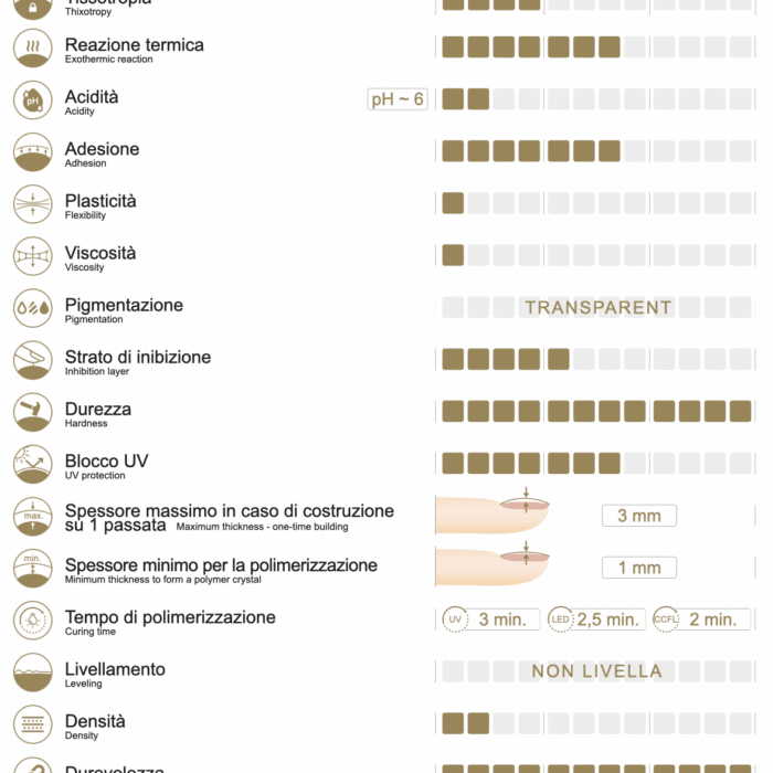 Funziona eccezionalmente bene con lo stile strutturale di tipo francese, in cui la precisione e l’estetica della linea del sorriso sono importanti. La sua base incolore lo rende insostituibile anche per tecniche più creative, come il french fantasy, le decorazioni acquario o le unghie da principessa, in cui la profondità e la perfetta trasparenza del materiale sono importanti.