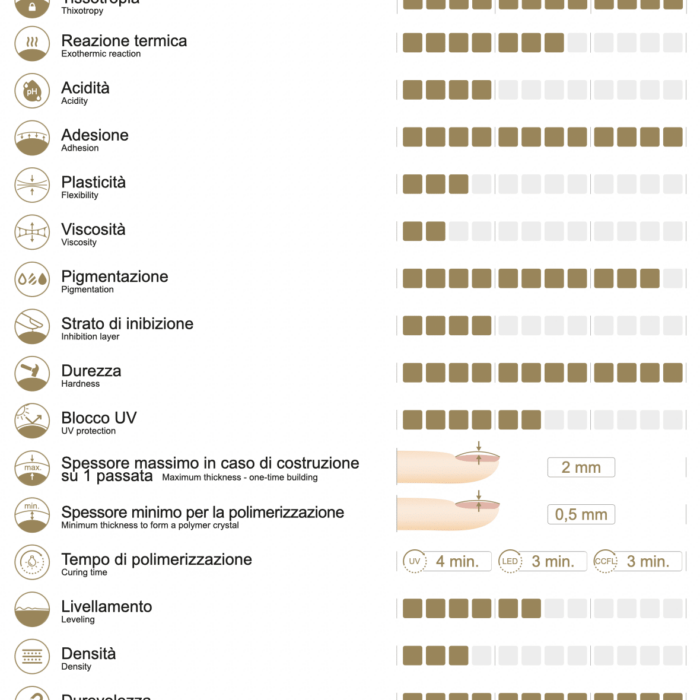 - eccellente tixotropia il prodotto ha un’alta tensione superficiale, si livella molto lentamente, quindi non allaga le cuticole e dà il tempo di costruire tutte le unghie,