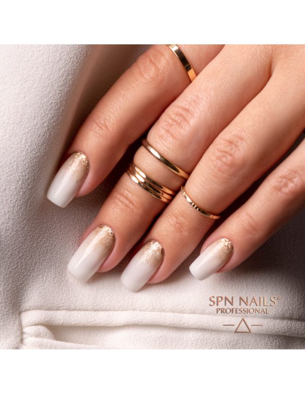 Lavorare con lui è veloce e piacevole, e per i nostri clienti praticamente indolore, grazie alla ridotta sensazione di bruciore. Il gel è resistente ai danni meccanici e non crea bolle d’aria. Ha una bella sfumatura lattiginosa che non ingiallisce e ha un bell’aspetto nelle creazioni con l’aggiunta di glitter o con elementi incorporati lucicanti.