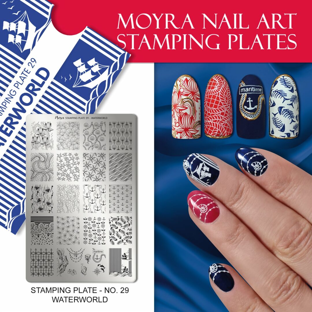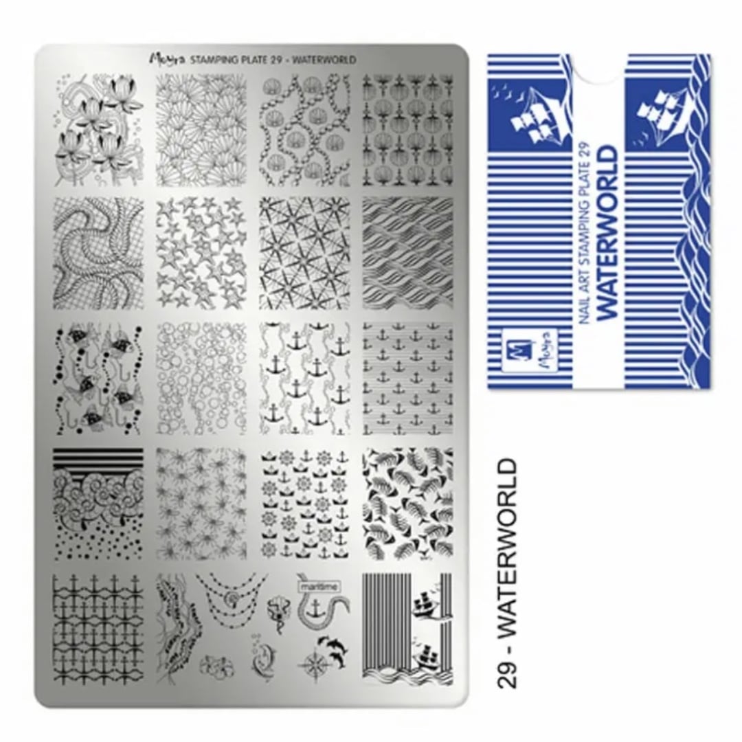 Waterworld è la piastra n.29 ad alta precisione Moyra con disegni dedicati al mare, conchiglie, ancore, timoni, reti da pesca e tanti altri motivi.