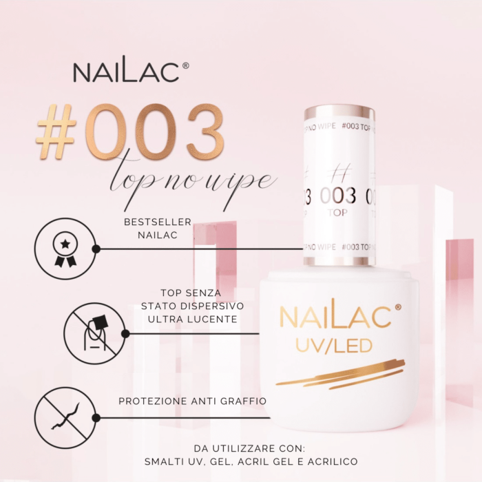 Top Coat No Wipe NEW 10 ml è un prodotto bestseller e pluripremiato. Offre incredibile durata e a lucentezza. Resiste a graffi, abrasioni e altri danni meccanici. Famoso per il suo effetto “wet shine” fino a 5 settimane. Non presenta dispersioni ed è perfettamente liscio una volta indurito. Non ha odore enon intasa le frese.
