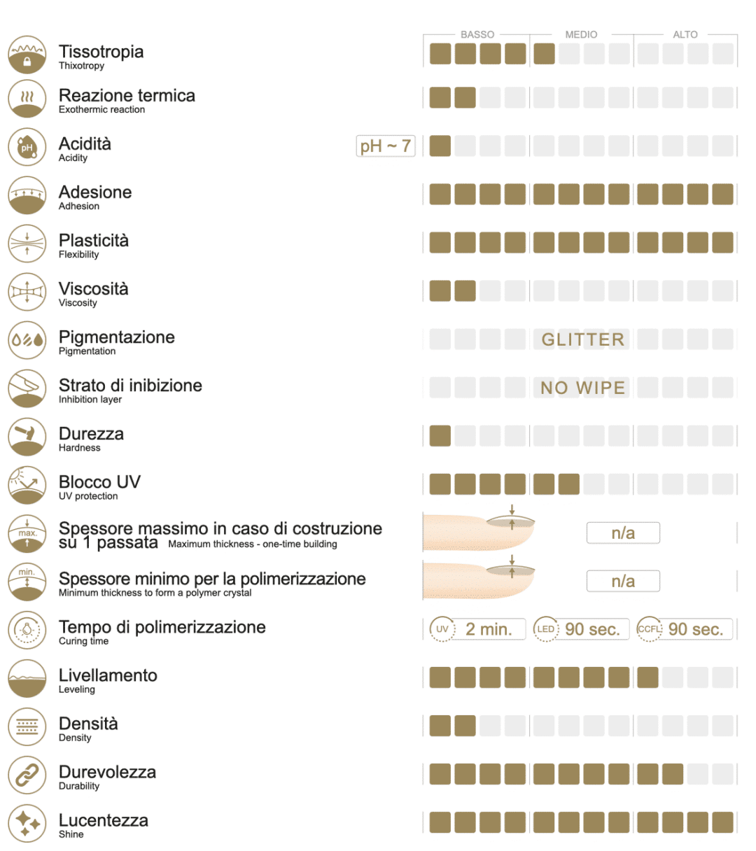 Top Coat di consistenza sottile, si livella moderatamente, quindi funziona bene. Non allaga le cuticole del cliente e non crea spessore extra. Dona una forte lucentezza che dura fino a 5 settimane. È abbastanza resistente e non si stacca dalle punte delle unghie. Top coat senza strato inibitore