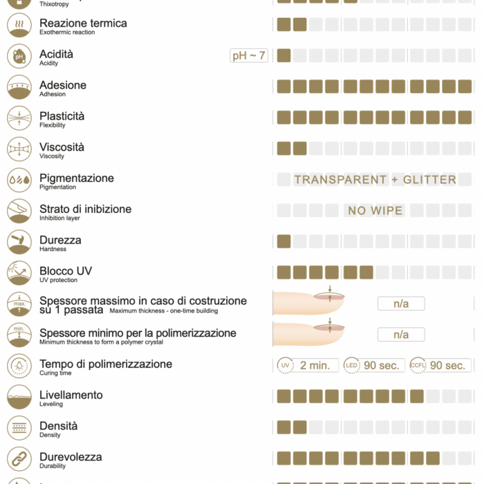 Il top coat ha una consistenza leggera e fluida, che lo rende facile da stendere e distribuire uniformemente. Si livella perfettamente e non cola sulle cuticole, consentendo un’applicazione pulita e precisa. La tensione superficiale media garantisce un controllo completo durante l’applicazione e previene la “spalmatura”. Dopo la polimerizzazione, il top coat non lascia uno strato di dispersione: la superficie è immediatamente liscia, lucida e pronta all’uso. Il prodotto è altamente resistente all’abrasione e ai graffi, proteggendo la manicure fino a 3-4 settimane. Una quantità accuratamente selezionata di particelle crea un effetto elegante e discreto. La composizione include microparticelle rotonde delle stesse dimensioni e particelle di lamina colorate e lucide che brillano splendidamente in controluce. L’effetto è dinamico: il colore delle particelle cambia a seconda del movimento della mano e dell’angolazione della luce, creando l’effetto di scintillii multicolori. Il top coat è leggero, non appesantisce l’unghia e ha un aspetto delicato. È un prodotto versatile: si abbina sia ai colori chiari che a quelli scuri, aggiungendo un finish elegante. Le particelle sono impercettibili e non aumentano lo spessore dello strato.